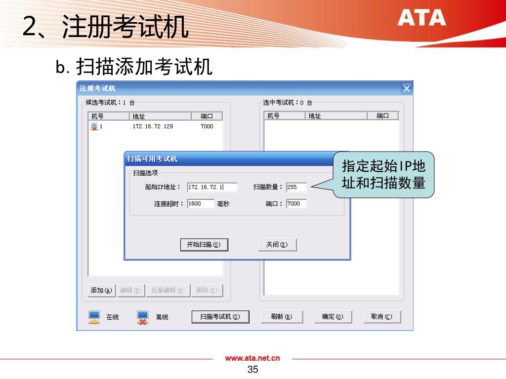 2、注册考试机 b.扫描添加考试机 指定起始IP地址和扫描数量 35