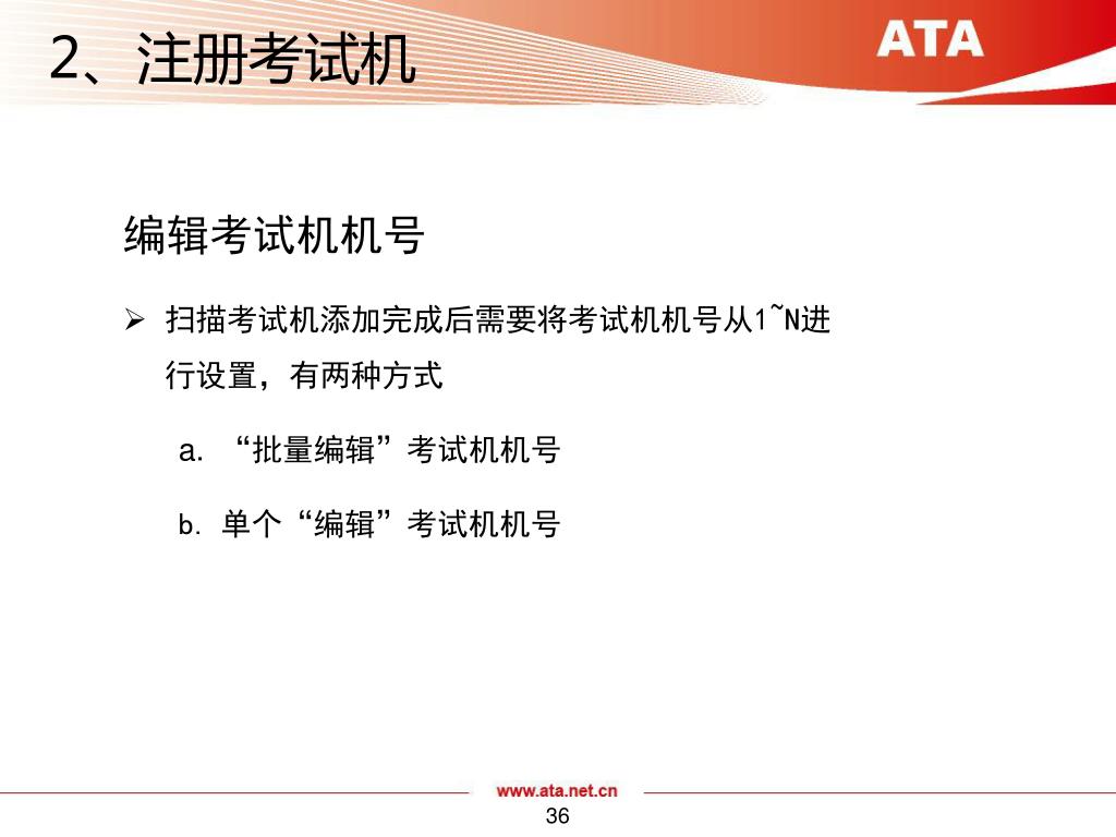 2、注册考试机 编辑考试机机号 • 扫描考试机添加完成后需要将考试机机号从1~N进行设置,有两种方式 • “批量编辑”考试机机号 • 单个“编辑”考试机机号 36