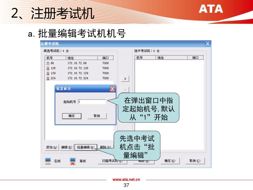 2、注册考试机 a.批量编辑考试机机号 在弹出窗口中指定起始机号,默认从“1”开始 先选中考试机点击“批量编辑” 37