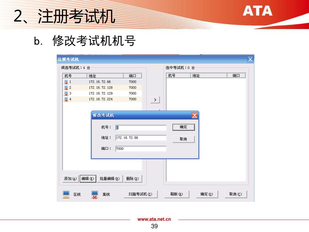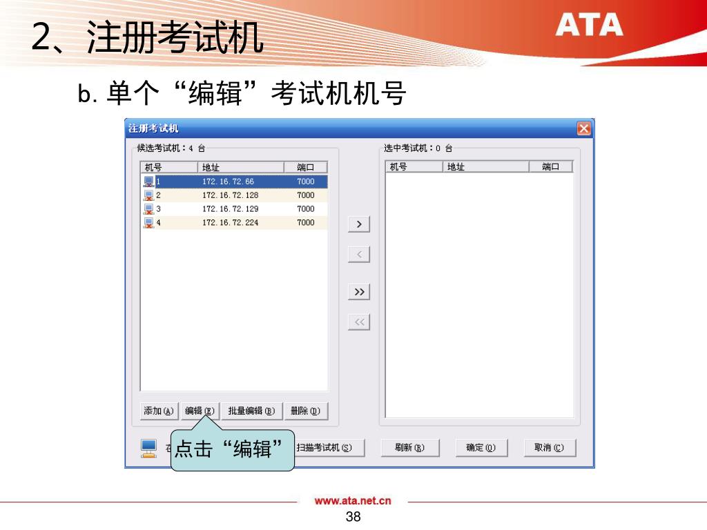 2、注册考试机 b.单个“编辑”考试机机号 点击“编辑” 38