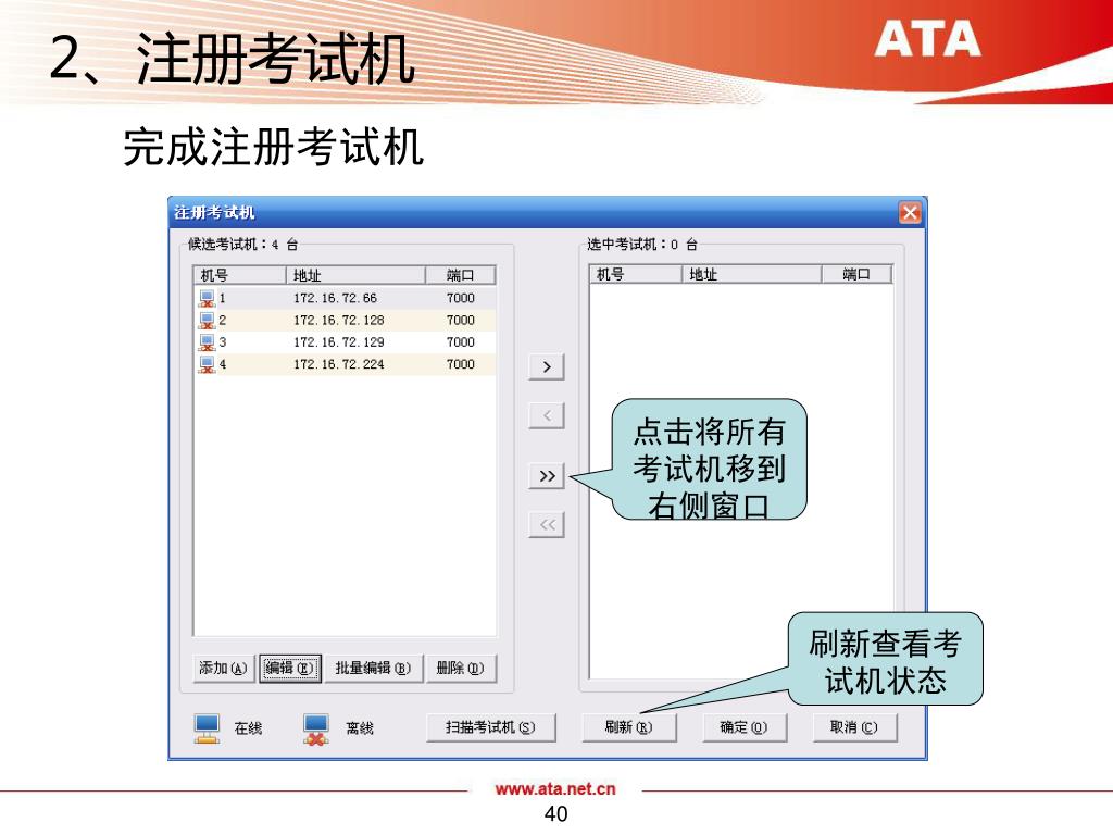 2、注册考试机 完成注册考试机 点击将所有考试机移到右侧窗口 刷新查看考试机状态 40