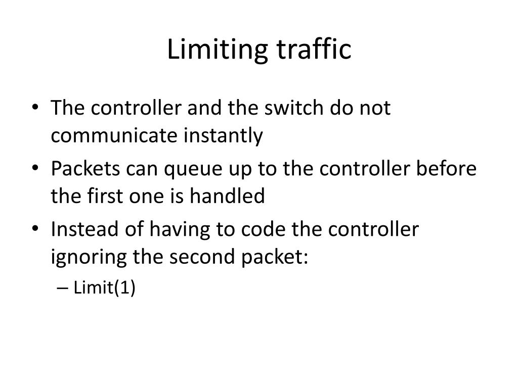 Limiting traffic • The controller and the switch do not communicate instantly • Packets can queue up to the controller before the first one is handled • Instead of having to code the controller ignoring the second packet: • Limit(1)
