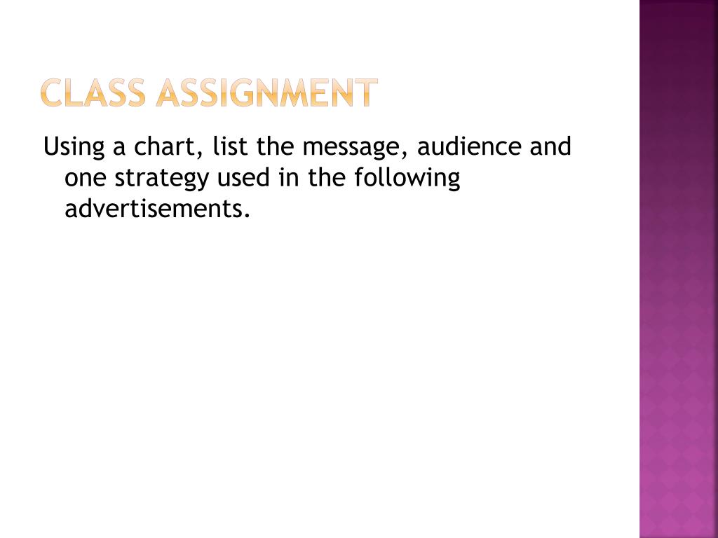 Class Assignment Using a chart, list the message, audience and one strategy used in the following advertisements.