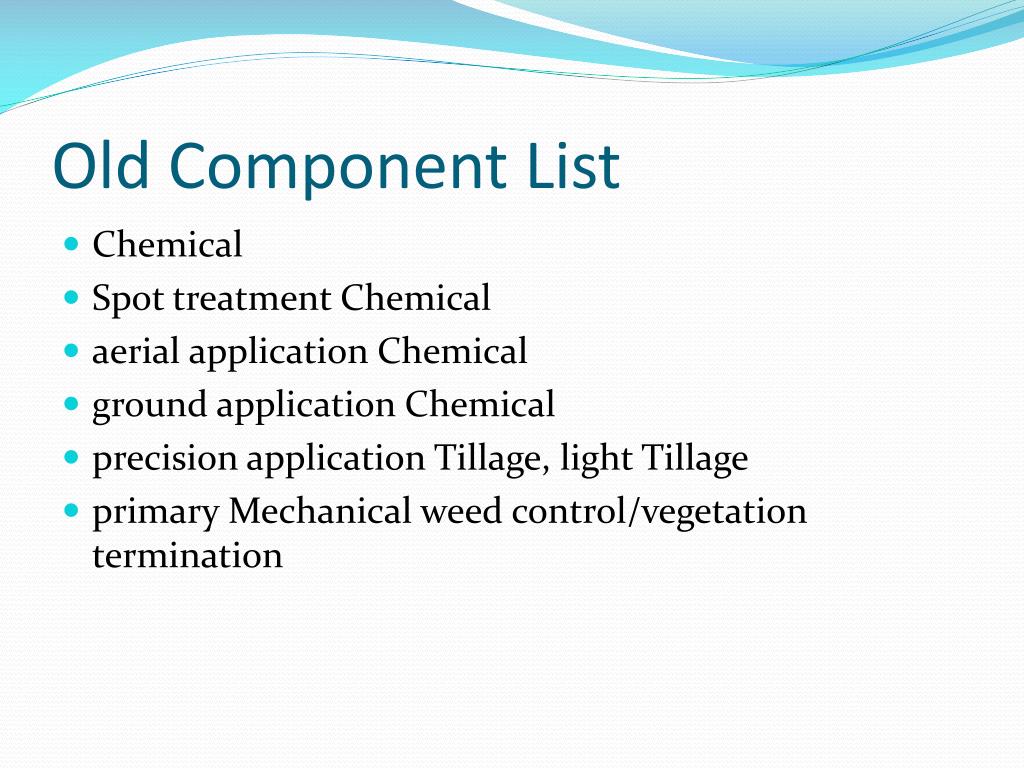 Old Component List • Chemical • Spot treatment Chemical • aerial application Chemical • ground application Chemical • precision applicationTillage, light Tillage • primary Mechanical weed control/vegetation termination
