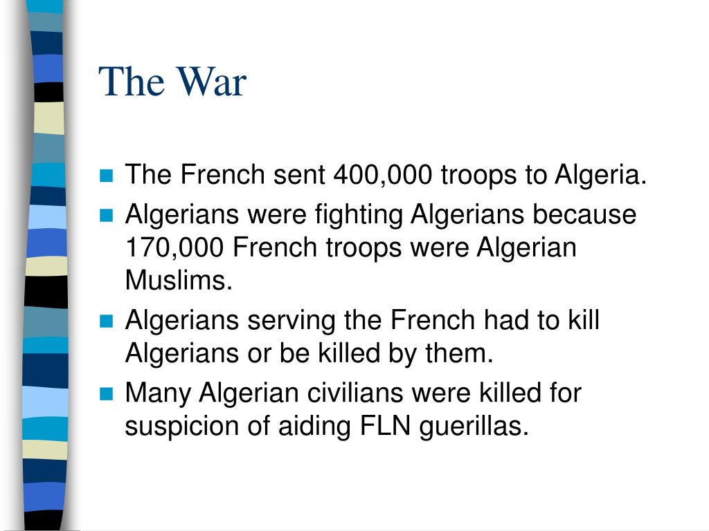 The War • The French sent 400,000 troops to Algeria. • Algerians were fighting Algerians because 170,000 French troops were Algerian Muslims. • Algerians serving the French had to kill Algerians or be killed by them. • Many Algerian civilians were killed for suspicion of aiding FLN guerillas.