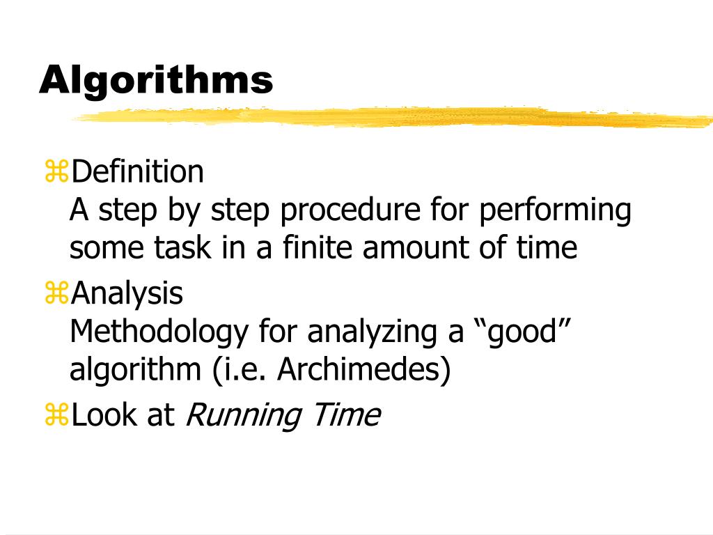 Algorithms • DefinitionA step by step procedure for performing some task in a finite amount of time • Analysis Methodology for analyzing a “good” algorithm (i.e. Archimedes) • Look at Running Time