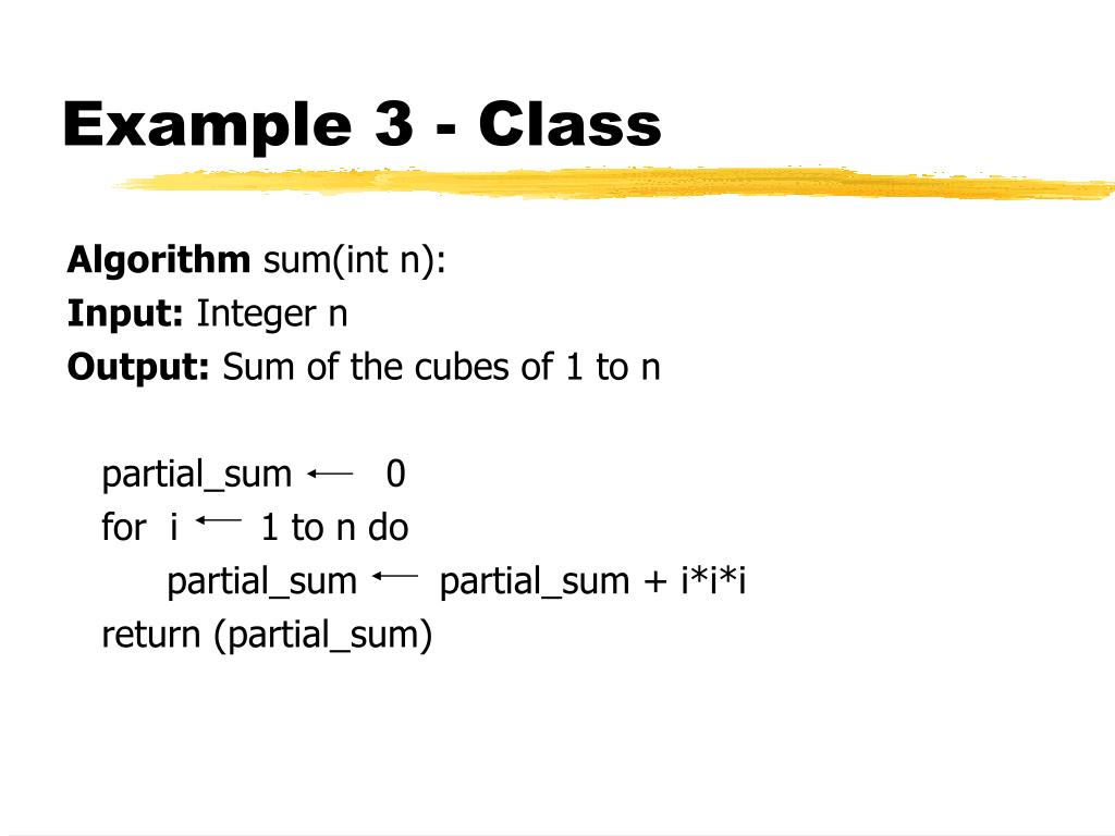 Example 3 - Class Algorithm sum(int n): Input: Integer n Output: Sum of the cubes of 1 to n partial_sum 0 for i 1 to n do partial_sum partial_sum + i*i*i return (partial_sum)