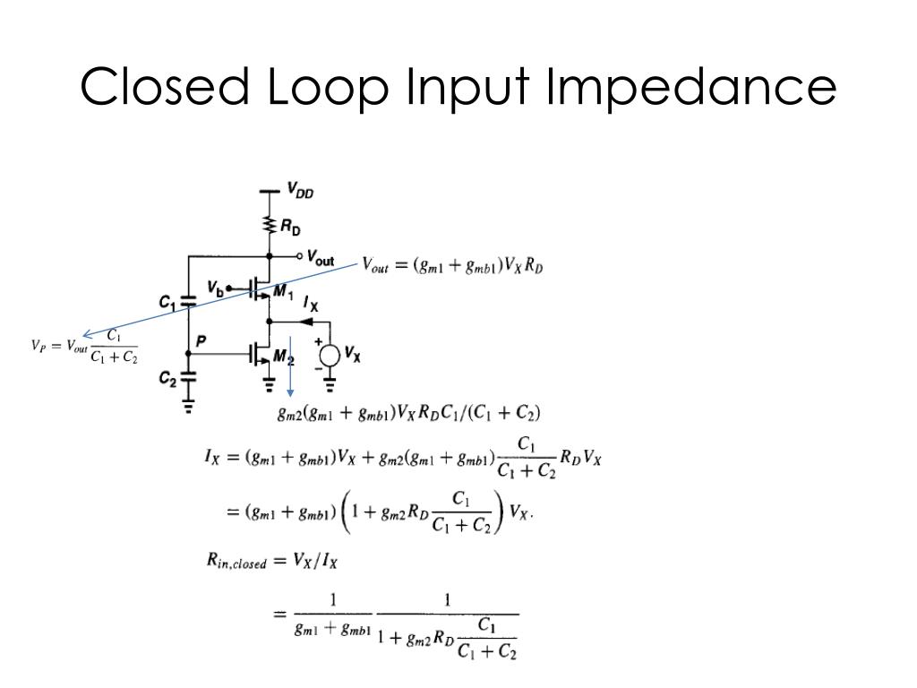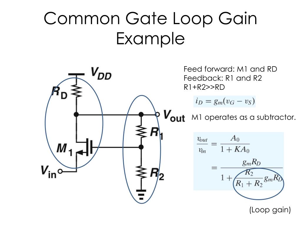 Common Gate Loop Gain Example Feed forward: M1 and RD Feedback: R1 and R2 R1+R2>>RD M1 operates as a subtractor. (Loop gain)