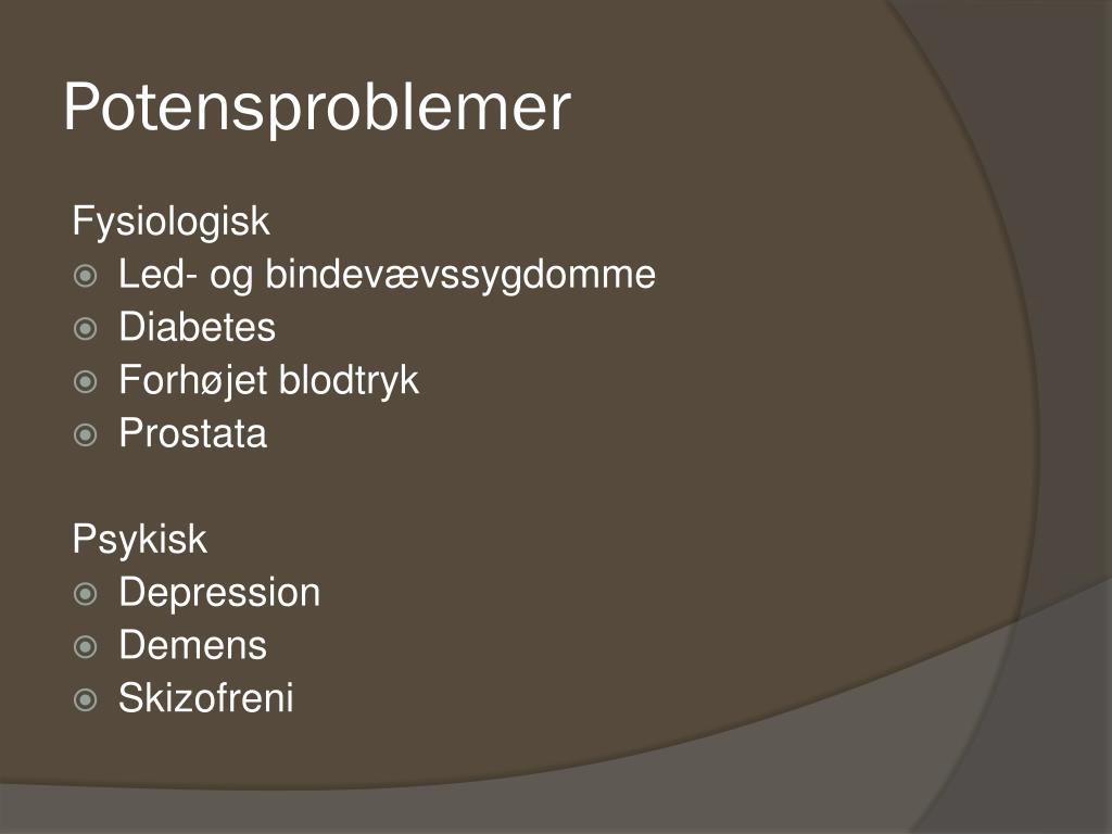 Potensproblemer Fysiologisk • Led- ogbindevævssygdomme • Diabetes • Forhøjetblodtryk • Prostata Psykisk • Depression • Demens • Skizofreni