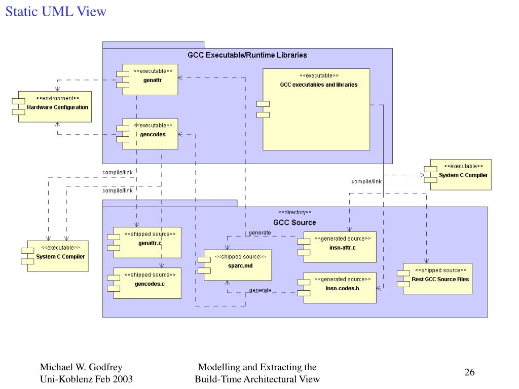 Some interesting build-time activities • Automatic “source” code generation • Build-time vs. development-time (e.g., GCC vs. JDK/JNI) • Targeted at a large range of CPU/OS platforms • Implementation (algorithms) are highly platform dependent. • Conditional compilation is not viable. • Bootstrapping • Cross-platform compilation • Generation of VMs/interpreters for “special languages” • Build-time component installation • Runtime library optimization • e.g., VIM text editor • … Modelling and Extracting the Build-Time Architectural View