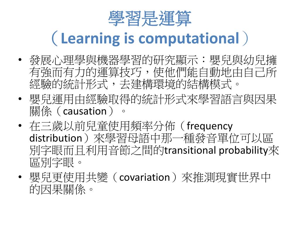 學習是運算(Learning is computational) • 發展心理學與機器學習的研究顯示:嬰兒與幼兒擁有強而有力的運算技巧,使他們能自動地由自己所經驗的統計形式,去建構環境的結構模式。 • 嬰兒運用由經驗取得的統計形式來學習語言與因果關係(causation)。 • 在三歲以前兒童使用頻率分佈(frequency distribution)來學習母語中那一種發音單位可以區別字眼而且利用音節之間的transitional probability來區別字眼。 • 嬰兒更使用共變(covariation)來推測現實世界中的因果關係。