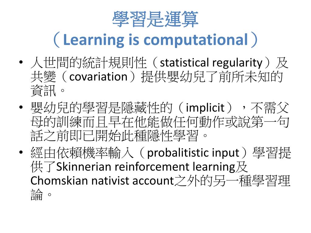 學習是運算(Learning is computational) • 人世間的統計規則性(statistical regularity)及共變(covariation)提供嬰幼兒了前所未知的資訊。 • 嬰幼兒的學習是隱藏性的(implicit),不需父母的訓練而且早在他能做任何動作或說第一句話之前即已開始此種隱性學習。 • 經由依賴機率輸入(probalitistic input)學習提供了Skinnerian reinforcement learning及Chomskian nativist account之外的另一種學習理論。