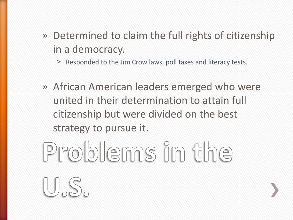 Determined to claim the full rights of citizenship in a democracy. • Responded to the Jim Crow laws, poll taxes and literacy tests. • African American leaders emerged who were united in their determination to attain full citizenship but were divided on the best strategy to pursue it. Problems in the U.S.