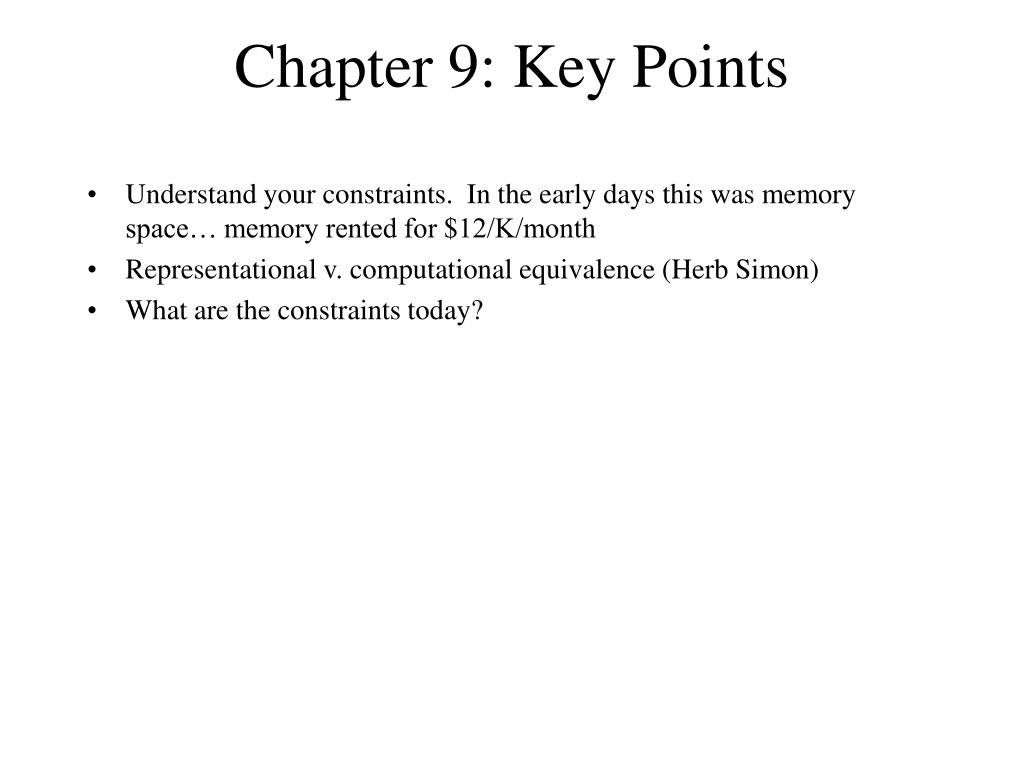 Chapter 9: Key Points • Understand your constraints. In the early days this was memory space… memory rented for $12/K/month • Representational v. computational equivalence (Herb Simon) • What are the constraints today?