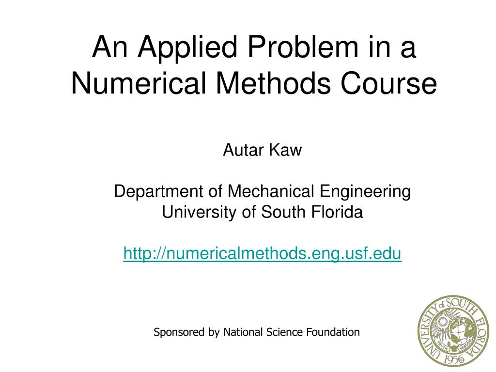 An Applied Problem in a Numerical Methods Course Autar Kaw Department of Mechanical Engineering University of South Florida http://numericalmethods.eng.usf.edu Sponsored by National Science Foundation