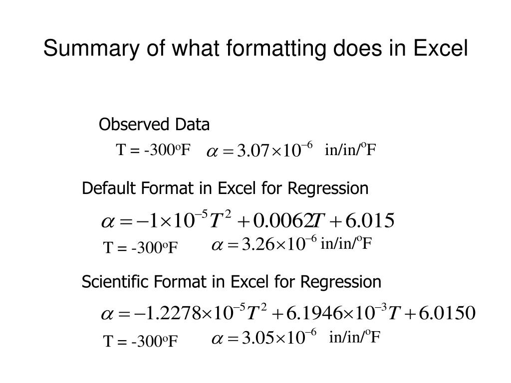 Observed Data T = -300oF in/in/oF Default Format in Excel for Regression in/in/oF T = -300oF Scientific Format in Excel for Regression T = -300oF Summary of what formatting does in Excel in/in/oF