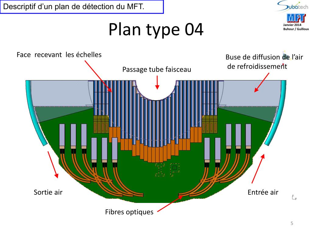 Descriptif d’un plan de détection du MFT. MFT MFT Janvier 2014 Buhour / Guilloux Plan type 04 Face recevant les échelles Buse de diffusion de l’air de refroidissement Passage tube faisceau Sortie air Entrée air Fibres optiques