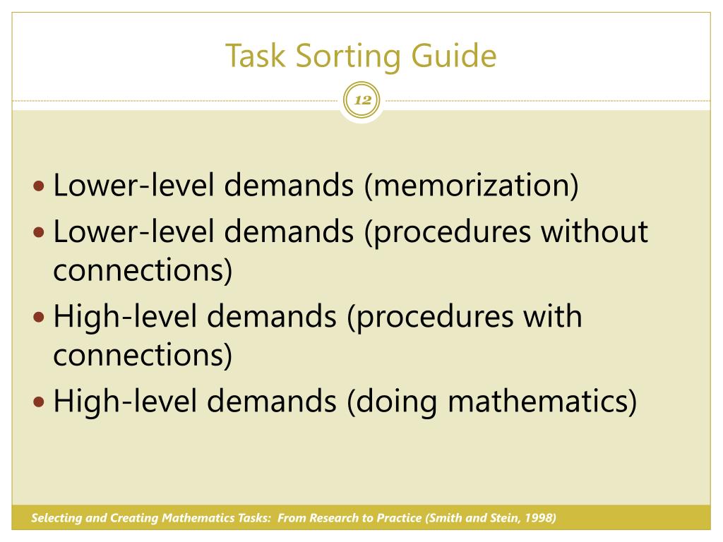 Task Sorting Guide • Lower-level demands (memorization) • Lower-level demands (procedures without connections) • High-level demands (procedures with connections) • High-level demands (doing mathematics) Selecting and Creating Mathematics Tasks: From Research to Practice (Smith and Stein, 1998)