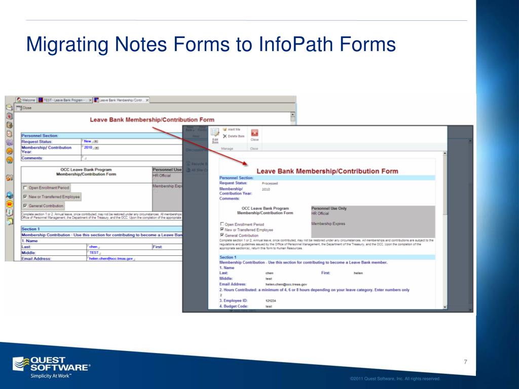 Form migration artifacts • Generated InfoPath form template • Customize in design mode as needed • Publish to SharePoint from InfoPath Designer • InfoPath form with developer markup (optional) • Preview in “fill” mode • Shows all hidden text • Hover over icons for developer information • Migration report (optional) • Shows all migrated and non-migrated elements • Use a checklist for developer to complete the form • Debugging information folder (optional) • Log file and intermediate files for Quest support