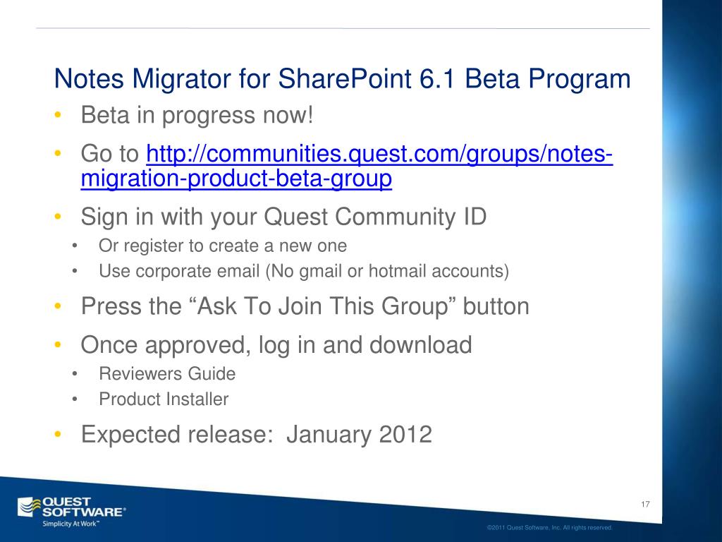 Notes Migrator for SharePoint 6.1 Beta Program • Beta in progress now! • Go to http://communities.quest.com/groups/notes-migration-product-beta-group • Sign in with your Quest Community ID • Or register to create a new one • Use corporate email (No gmail or hotmail accounts) • Press the “Ask To Join This Group” button • Once approved, log in and download • Reviewers Guide • Product Installer • Expected release: January 2012