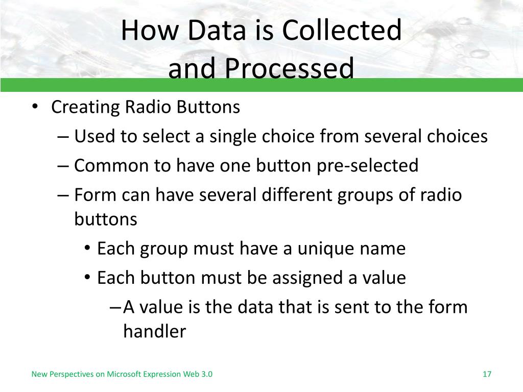 How Data is Collectedand Processed • Creating Radio Buttons • Used to select a single choice from several choices • Common to have one button pre-selected • Form can have several different groups of radio buttons • Each group must have a unique name • Each button must be assigned a value • A value is the data that is sent to the form handler New Perspectives on Microsoft Expression Web 3.0