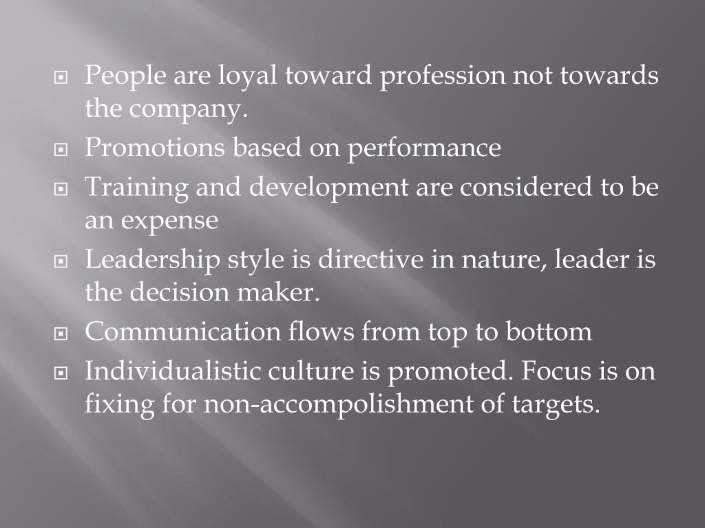 People are loyal toward profession not towards the company. • Promotions based on performance • Training and development are considered to be an expense • Leadership style is directive in nature, leader is the decision maker. • Communication flows from top to bottom • Individualistic culture is promoted. Focus is on fixing for non-accompolishment of targets.