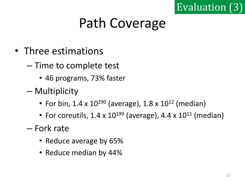 Evaluation (3) Path Coverage • Three estimations • Time to complete test • 46 programs, 73% faster • Multiplicity • For bin, 1.4 x 10290(average), 1.8 x 1012(median) • For coreutils, 1.4 x 10199 (average), 4.4 x 1011 (median) • Fork rate • Reduce average by 65% • Reduce median by 44%