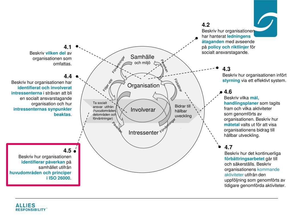 4.2 Beskriv hur organisationen har hanterat ledningens åtaganden med avseende på policy och riktlinjer för socialt ansvarstagande. 4.1 Beskriv vilken del av organisationensom omfattas. Samhälleoch miljö Förväntningar Påverkan 4.3 Beskriv hur organisationen infört styrningvia ett effektivt system. 4.4 Beskriv hur organisationen har identifierat och involverat intressenterna i strävan att bli en socialt ansvarstagande organisation och hur intressenternas synpunkter beaktas. Organisation Följerupp Förbättrar 4.6 Beskriv vilka mål, handlingsplaner som tagits fram och vilka aktiviteter som genomförts av organisationen. Beskriv hur mätetalvalts ut för att visa organisationens bidrag till hållbar utveckling. Ta socialtansvarutifrån (huvudområden, delområdenochförväntningar) Bidrar till hållbaruveckling Involverar Förväntningar Påverkan Intressenter 4.7 Beskriv hur det kontinuerliga förbättringsarbetet går till och säkerställs. Beskriv organisationens kommande aktiviteter utifrån den uppföljning som genomförts av tidigare genomförda aktiviteter. 4.5 Beskriv hur organisationen identifierar påverkan på samhället utifrån huvudområden och principer i ISO 26000.
