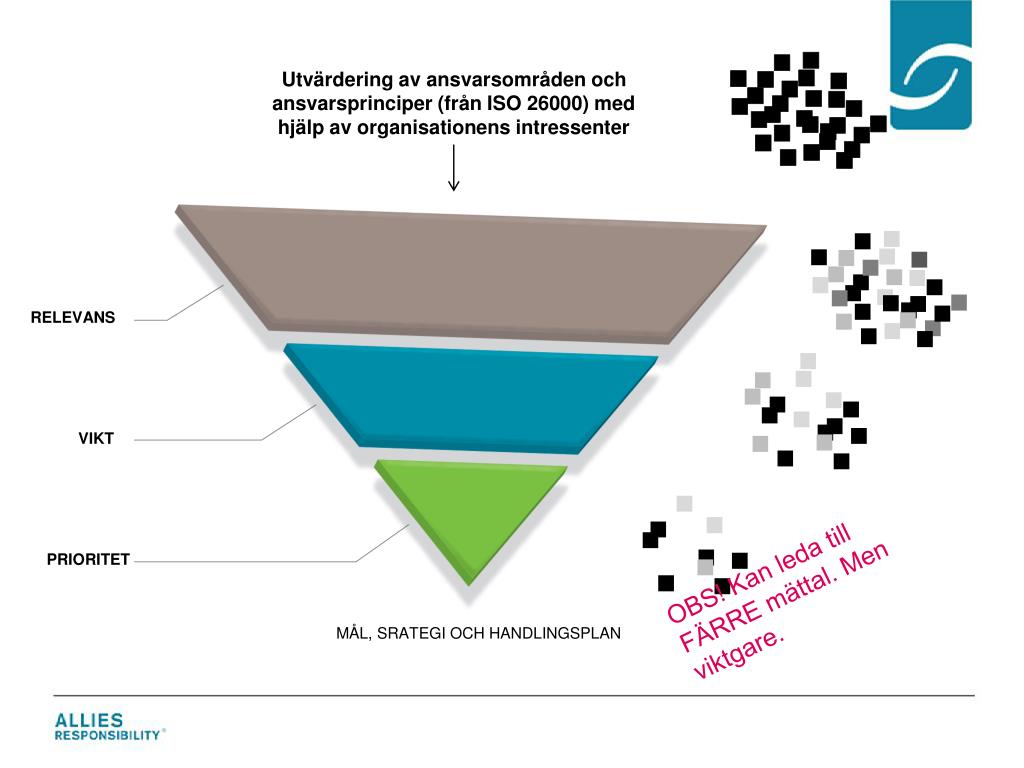 Utvärdering av ansvarsområden och ansvarsprinciper (från ISO 26000) med hjälp av organisationens intressenter RELEVANS VIKT OBS! Kan leda till FÄRRE mättal. Men viktgare. PRIORITET MÅL, SRATEGI OCH HANDLINGSPLAN
