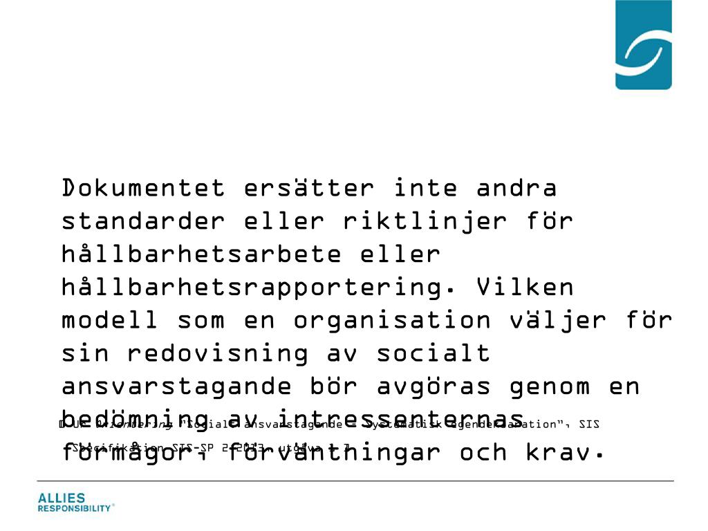 Dokumentet ersätter inte andra standarder eller riktlinjer för hållbarhetsarbete eller hållbarhetsrapportering. Vilken modell som en organisation väljer för sin redovisning av socialt ansvarstagande bör avgöras genom en bedömning av intressenternas förmågor, förväntningar och krav. [ Ur Orientering ”Socialt ansvarstagande – Systematisk egendeklaration”, SIS Specifikation SIS-SP 2:2013, utgåva 1 ]
