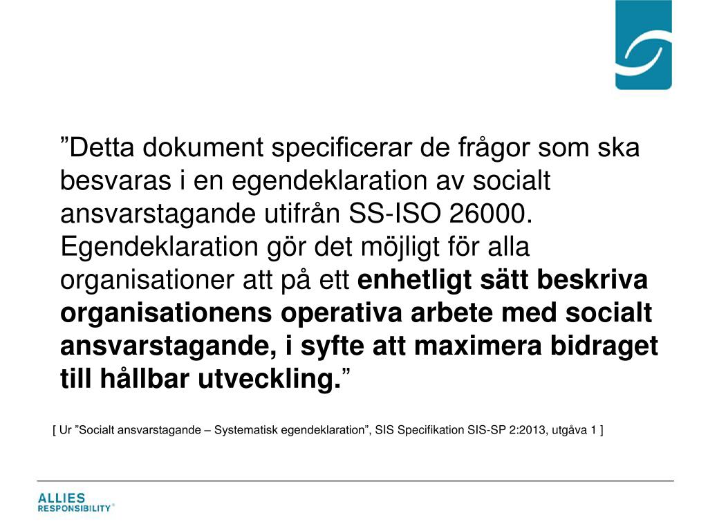 ”Detta dokument specificerar de frågor som ska besvaras i en egendeklaration av socialt ansvarstagande utifrån SS-ISO 26000. Egendeklaration gör det möjligt för alla organisationer att på ett enhetligt sätt beskriva organisationens operativa arbete med socialt ansvarstagande, i syfte att maximera bidraget till hållbar utveckling.” [ Ur ”Socialt ansvarstagande – Systematisk egendeklaration”, SIS Specifikation SIS-SP 2:2013, utgåva 1 ]