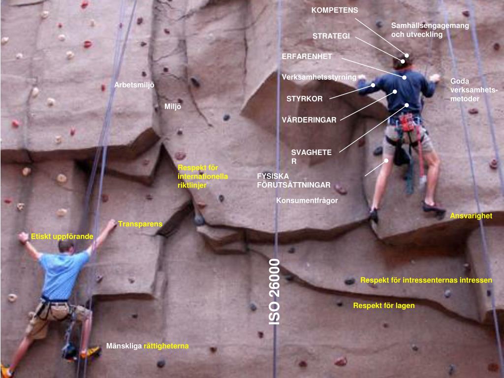 KOMPETENS Samhällsengagemang och utveckling STRATEGI ERFARENHET Verksamhetsstyrning Goda verksamhets-metoder Arbetsmiljö STYRKOR Miljö VÄRDERINGAR SVAGHETER Respekt för internationella riktlinjer FYSISKA FÖRUTSÄTTNINGAR Konsumentfrågor Ansvarighet Transparens Etiskt uppförande ISO 26000 Respekt för intressenternas intressen Respekt för lagen Mänskliga rättigheterna