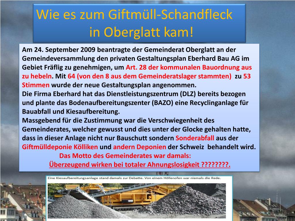 Wie es zum Giftmüll-Schandfleck in Oberglatt kam! Am 24. September 2009 beantragte der Gemeinderat Oberglatt an der Gemeindeversammlung den privaten Gestaltungsplan Eberhard Bau AG im Gebiet Fräflig zu genehmigen, um Art. 28 der kommunalen Bauordnung aus zu hebeln. Mit 64 (von den 8 aus dem Gemeinderatslager stammten) zu 53Stimmen wurde der neue Gestaltungsplan angenommen. Die Firma Eberhard hat das Dienstleistungszentrum (DLZ) bereits bezogen und plante das Bodenaufbereitungszenter (BAZO) eine Recyclinganlage für Bauabfall und Kiesaufbereitung. Massgebend für die Zustimmung war die Verschwiegenheit des Gemeinderates, welcher gewusst und dies unter der Glocke gehalten hatte, dass in dieser Anlage nicht nur Bauschutt sondern Sonderabfall aus der Giftmülldeponie Köllikenund andern Deponien der Schweiz behandelt wird. Das Motto des Gemeinderates war damals: Überzeugend wirken bei totaler Ahnungslosigkeit ????????.