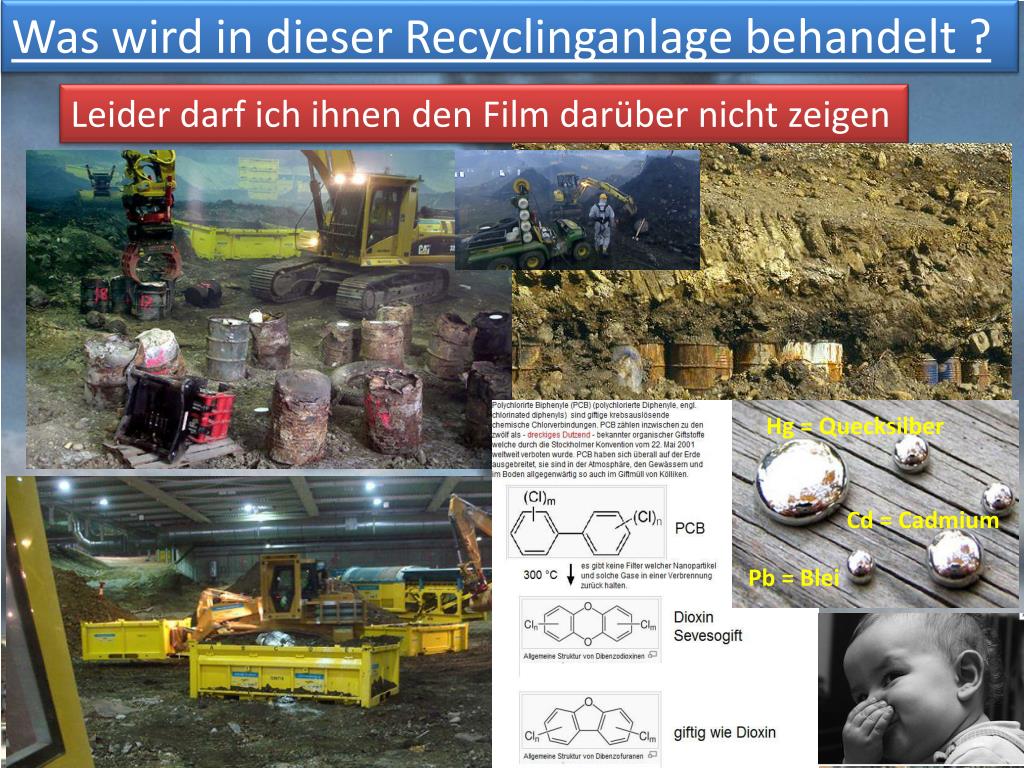 Was wird in dieser Recyclinganlage behandelt ? Leider darf ich ihnen den Film darüber nicht zeigen Recycling Anlage Eberhard Pionier Giftmüllrecycling Hg = Quecksilber Cd = Cadmium Pb = Blei