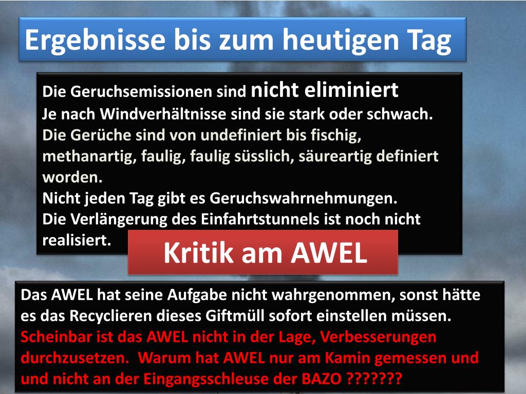 Ergebnisse bis zum heutigen Tag Die Geruchsemissionen sind nicht eliminiert Je nach Windverhältnisse sind sie stark oder schwach. Die Gerüche sind von undefiniert bis fischig, methanartig, faulig, faulig süsslich, säureartig definiert worden. Nicht jeden Tag gibt es Geruchswahrnehmungen. Die Verlängerung des Einfahrtstunnels ist noch nicht realisiert. Kritik am AWEL Das AWEL hat seine Aufgabe nicht wahrgenommen, sonst hätte es das Recyclieren dieses Giftmüll sofort einstellen müssen. Scheinbar ist das AWEL nicht in der Lage, Verbesserungen durchzusetzen. Warum hat AWEL nur am Kamin gemessen und und nicht an der Eingangsschleuse der BAZO ???????