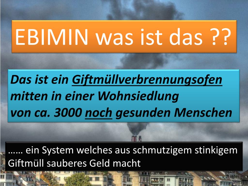EBIMIN was ist das ?? Das ist ein Giftmüllverbrennungsofen mitten in einer Wohnsiedlung von ca. 3000 noch gesunden Menschen …… ein System welches aus schmutzigem stinkigem Giftmüll sauberes Geld macht
