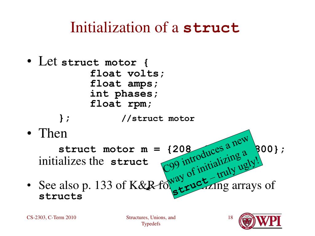 struct • Defines a new type • I.e., a new kind of data type that compiler regards as a unit • E.g., struct motor {float volts; //voltage of the motorfloat amps; //amperage of the motorint phases; //# of phases of the motorfloat rpm; //rotational speed of motor }; //struct motor Structures, Unions, and Typedefs