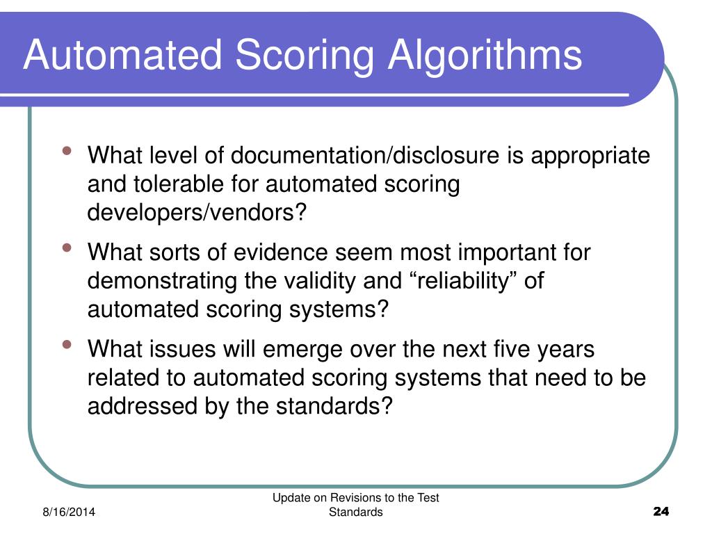 Automated Scoring Algorithms What level of documentation/disclosure is appropriate and tolerable for automated scoring developers/vendors? What sorts of evidence seem most important for demonstrating the validity and “reliability” of automated scoring systems? What issues will emerge over the next five years related to automated scoring systems that need to be addressed by the standards? Update on Revisions to the Test Standards 24