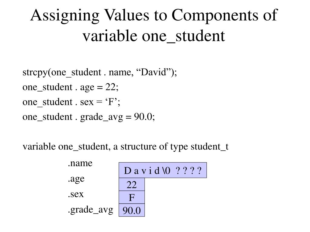 .name D a v i d \0 ? ? ? ? .age 22 .sex F 90.0 .grade_avg Assigning Values to Components of variable one_student • strcpy(one_student . name, “David”); • one_student . age = 22; • one_student . sex = ‘F’; • one_student . grade_avg = 90.0; • variable one_student, a structure of type student_t