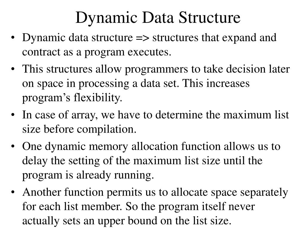 Dynamic Data Structure • Dynamic data structure => structures that expand and contract as a program executes. • This structures allow programmers to take decision later on space in processing a data set. This increases program’s flexibility. • In case of array, we have to determine the maximum list size before compilation. • One dynamic memory allocation function allows us to delay the setting of the maximum list size until the program is already running. • Another function permits us to allocate space separately for each list member. So the program itself never actually sets an upper bound on the list size.