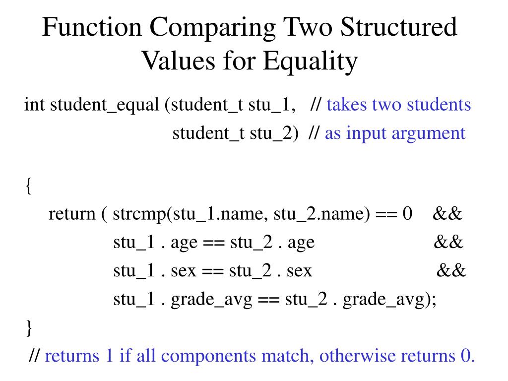 Function Comparing Two Structured Values for Equality • int student_equal (student_t stu_1, // takes two students • student_t stu_2) // as input argument • { • return ( strcmp(stu_1.name, stu_2.name) == 0 && • stu_1 . age == stu_2 . age && • stu_1 . sex == stu_2 . sex && • stu_1 . grade_avg == stu_2 . grade_avg); • } • // returns 1 if all components match, otherwise returns 0.