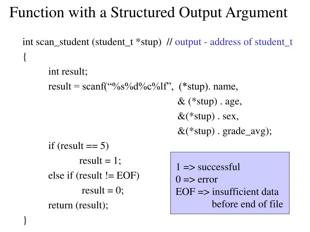 Function with a Structured Output Argument • int scan_student (student_t *stup) // output - address of student_t • { • int result; • result = scanf(“%s%d%c%lf”, (*stup). name, • & (*stup) . age, • &(*stup) . sex, • &(*stup) . grade_avg); • if (result == 5) • result = 1; • else if (result != EOF) • result = 0; • return (result); • } 1 => successful 0 => error EOF => insufficient data before end of file
