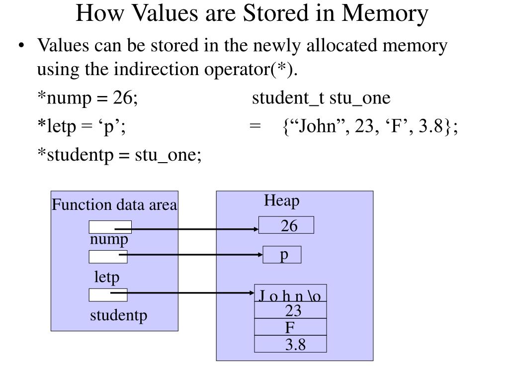 Heap Function data area 26 nump p letp 23 studentp F 3.8 How Values are Stored in Memory • Values can be stored in the newly allocated memory using the indirection operator(*). • *nump = 26; student_t stu_one • *letp = ‘p’; = {“John”, 23, ‘F’, 3.8}; • *studentp = stu_one; J o h n \o