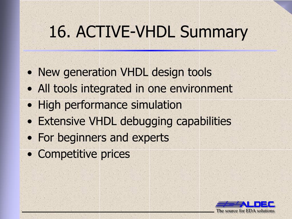 16. ACTIVE-VHDL Summary • New generation VHDL design tools • All tools integrated in one environment • High performance simulation • Extensive VHDL debugging capabilities • For beginners and experts • Competitive prices