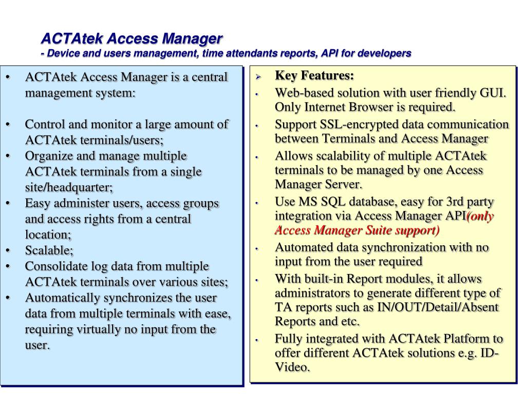 ACTAtek Access Manager - Device and users management, time attendants reports, API for developers ACTAtek Access Manager is a central management system: Control and monitor a large amount of ACTAtek terminals/users; Organize and manage multiple ACTAtek terminals from a single site/headquarter; Easy administer users, access groups andaccess rights from a central location; Scalable; Consolidate log data from multiple ACTAtek terminalsover various sites; Automatically synchronizes the user data from multiple terminals with ease, requiring virtually no input from the user. Key Features: Web-based solution with user friendly GUI. Only Internet Browser is required. Support SSL-encrypted data communication between Terminals and Access Manager Allows scalability of multiple ACTAtek terminals to be managed by one Access Manager Server. Use MS SQL database, easy for 3rd party integration via Access Manager API(only Access Manager Suite support) Automated data synchronization with no input from the user required With built-in Report modules, it allows administrators to generate different type of TA reports such as IN/OUT/Detail/Absent Reports and etc. Fully integrated with ACTAtek Platform to offer different ACTAtek solutions e.g. ID-Video.