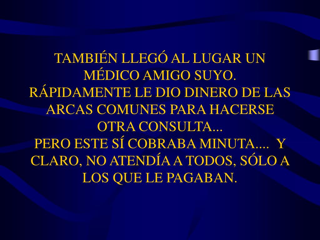 TAMBIÉN LLEGÓ AL LUGAR UN MÉDICO AMIGO SUYO.RÁPIDAMENTE LE DIO DINERO DE LAS ARCAS COMUNES PARA HACERSE OTRA CONSULTA...PERO ESTE SÍ COBRABA MINUTA.... Y CLARO, NO ATENDÍA A TODOS, SÓLO A LOS QUE LE PAGABAN.