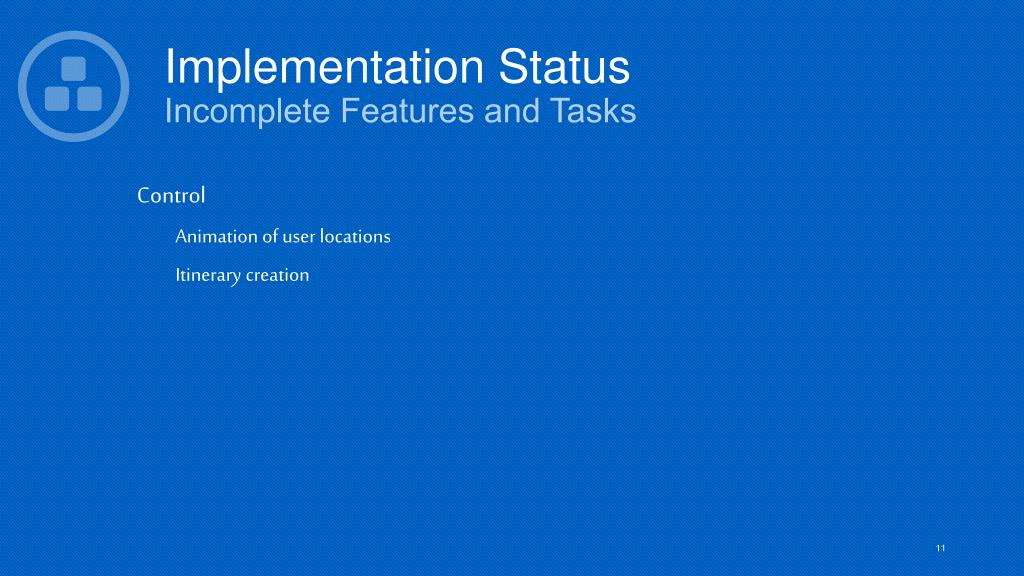 Implementation StatusIncomplete Features and Tasks Control Animation of user locations Itinerary creation