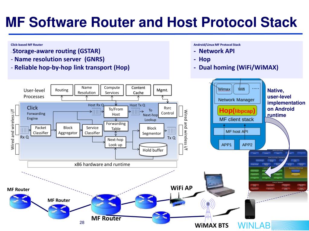 MF Software Router and Host Protocol Stack • Click-based MF Router • Storage-aware routing (GSTAR) • Name resolution server (GNRS) • Reliable hop-by-hop link transport (Hop) Android/Linux MF Protocol Stack - Network API - Hop - Dual homing (WiFi/WiMAX) Native, user-level implementation on Android runtime WiFi AP WiMAX BTS MF Router MF Router MF Router