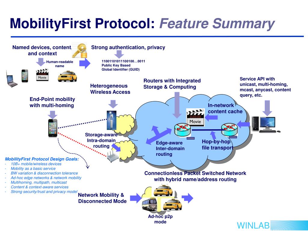 MobilityFirst Protocol: Feature Summary Named devices, content, and context Strong authentication, privacy 11001101011100100…0011 Public Key Based Global Identifier (GUID) Human-readable name Service API with unicast, multi-homing, mcast, anycast, content query, etc. Routers with Integrated Storage & Computing Heterogeneous Wireless Access End-Point mobility with multi-homing In-network content cache Storage-aware Intra-domain routing Hop-by-hop file transport Edge-aware Inter-domain routing • MobilityFirst Protocol Design Goals: • 10B+ mobile/wireless devices • Mobility as a basic service • BW variation & disconnection tolerance • Ad-hoc edge networks & network mobility • Multihoming, multipath, multicast • Content & context-aware services • Strong security/trust and privacy model Connectionless Packet Switched Network with hybrid name/address routing Network Mobility & Disconnected Mode Ad-hoc p2p mode