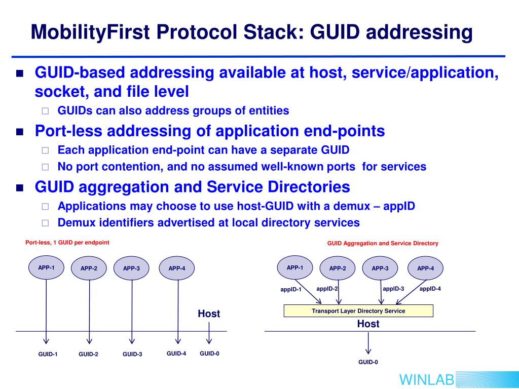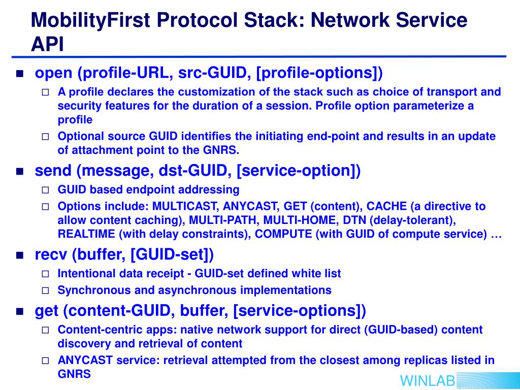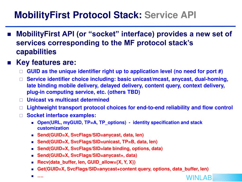 MobilityFirst Protocol Stack: Service API • MobilityFirst API (or “socket” interface) provides a new set of services corresponding to the MF protocol stack’s capabilities • Key features are: • GUID as the unique identifier right up to application level (no need for port #) • Service identifier choice including: basic unicast/mcast, anycast, dual-homing, late binding mobile delivery, delayed delivery, content query, context delivery, plug-in computing service, etc. (others TBD) • Unicast vs multicast determined • Lightweight transport protocol choices for end-to-end reliability and flow control • Socket interface examples: • Open(URL, myGUID, TP=A, TP_options) - identity specification and stack customization • Send(GUID=X, SvcFlags/SID=anycast, data, len) • Send(GUID=X, SvcFlags/SID=unicast, TP=B, data, len) • Send(GUID=X, SvcFlags/SID=late binding, options, data) • Send(GUID=X, SvcFlags/SID=anycast+, data) • Recv(data_buffer, len, GUID_allow={X, Y, X}) • Get(GUID=X, SvcFlags/SID=anycast+content query, options, data_buffer, len) • ….